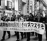 各界連とともに広島市本通の繁華街で「昼休みデモ」を行い、約百人余が市民によびかけました。広島の会はサンタの赤い帽子をかぶり、「生活がないている」ポスターやのぼり、ハッピなどでアピールしました。。