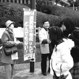各界連と共同し、昼休み30分の宣伝で、過去10年間で最高の22人が参加。繁華街を圧倒した感じでした。「あなたたちに頑張ってもらわないと生活していけなくなる」「自民党はもうダメだ」の声が出されました。弘前市の会も宣伝に3人が参加しました。