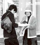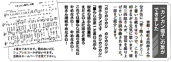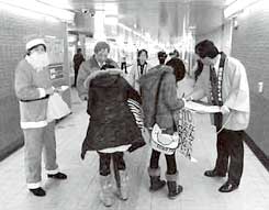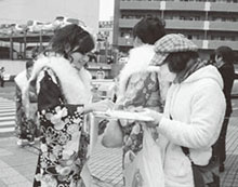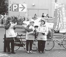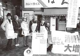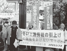 全国の会・東京の会は10日の成人式に池袋・東京芸術劇場前で、兎の着ぐるみをつけて新成人に、「消費税10%引き上げに賛成か反対か」のシール投票をよびかけ、ビラつきのティッシュを配りました。投票結果は、反対78票、賛成18票でした。 各地の宣伝・署名では埼玉・太田窪の会や長野・諏訪の会が元日、愛知・岡崎の会が3日、4日は京都の会が祇園石段下で、東京の会と江東の会が合同で富岡八幡宮前で、6日は兵庫の地域の会、9日は神奈川の会が銭洗弁天で、10日の成人式には熊本の会など、それぞれ草の根でとりくまれました。 12月24日のクリスマス宣伝では多くの会がサンタクロースの衣装をつけてにぎやかに宣伝。 「消費税増税のプレゼントなどとんでもない!」と、ビラをくばり、署名をよびかけました。 東京ではこの日、東大和の会、杉並の会、八王子の会、葛飾の会、西東京の会が、それぞれの地域でサンタさんの衣装で宣伝。 大田の会は宣伝カーを2台出して区内7ヶ所の商店街で宣伝し蒲田駅前で大宣伝を行いました。 そのほか多くのところで地元の各界連とともに行動を展開しました。 兵庫の会は北区の会??1日、須磨区の会??2日と16日、三田の会??2日、御影の会?17日、高砂民商の会?19日、灘区の会??24日と連続的に駅頭や商店街 で宣伝しました。福島・郡山の会や滋賀の会、富山の会も24日宣伝にとりくみました。全国の会も東京の会とともにサンタの衣装を着て宣伝しました。