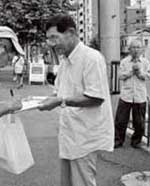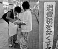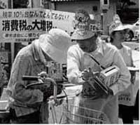 24日、富山駅地下道で定例の宣伝・署名行動をしました。 中学生3人組は、「1000円払えば1100円……ダメダメ」と署名しました。 ●暑さに負けず元気に宣伝 愛知・豊臣の会