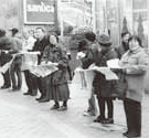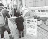 ●女性の参加で盛り上がった宣伝 千葉・柏の会 26日、会は佐倉の会にならって、高校生に積極的に話しかけ、署名をすすめたところ、20名近くが応じてくれました。こちらがビックリするほどでした。大人も「野田内閣はダメ、年金も減るし、増税どころではない」「生活が苦しい」と署名に応じてくれました。女性8人の参加で、訴え方、進め方が上手で盛り上がり、今年の締めにふさわしく大きな成果をあげたことに一同大いに確信を得ました。 |