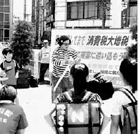 宣伝カーでテープを流しながら、ガソリンスタンド前や住宅街をまわり、車道で訴える形です。ビラは一軒一軒に手配り、およそ3千枚をまきました。署名は住宅を戸別に訪問して記入してもらいました。 ●保土ヶ谷の会も毎週宣伝 会のみなさんは毎週街頭宣伝(各界連と共同で2回、なくす会独自で2回)に取り組んでいます。各界連の要請行動にも参加しています。6・13国会要請行動や6・23国民大集会には23人が参加しました。 ●地元選出参議院議員全員へ要請はがきを出そう 埼玉の会は、地元選出参議院議員全員へ、「消費税増税はやめよ」の要請はがきを提出しようと呼びかけ ています。要請はがき700枚を印刷して、「ノー消費税」読者に5枚づつ郵送して、署名をしてすぐに送るよう要請しました。