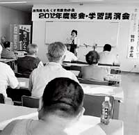 総会の前に、全国の会の牧野由子事務局長が講演。政府やマスコミの増税キャンペーンにもかかわらず国民の多くは増税に反対し、民主や自民の内部矛盾をひき起こしている。さらに運動を大きくし、増税法案を廃案に追い込もう、と訴えました。 総会ではこの一年、毎月の宣伝で520人の署名、1千枚のチラシ配布。約300人の賛同を得て「消費税NO」意見広告ポスター500枚を作成。ラジオで意見広告を流すなどの取り組みをしてきたことが報告されました。 |
