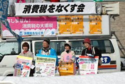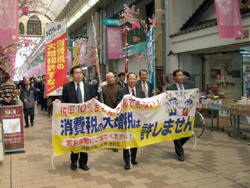 | 東京では、台東区のなくす会と各界連絡会が、午前9時に「私たちは、消費税増税に断固反対です」のアドバルーンを揚げ、12時から、待乳山(まつちやま)後援で「怒りの決起集会」を開きました。集会後、隣の隅田公園で宣伝。桜の開花を楽しみに集まった親子づれが多く、若いお母さんがピンクのリーフを受け取り、「消費税は子育てにも重くのしかかっています」と署名。子供たちには風船が渡されました。 東京では、江東、足立、港、中の、杉並、大田、板橋、北区、武蔵野、八王子、東大和、文京の会が、地元の様々な団体と協力もして、終日、都内各所で宣伝をくりひろげました。北区の十条銀差商店街では、練り歩き宣伝を実施。「景気が悪く、増税なんてとんでもない」の声が次々と。東大和では、3時半から5時まで、宣伝カーでスポットを流しながら、都営団地とスーパーの3カ所で宣伝。年金で暮らす高齢者から、「増税はやめて欲しい」の声がたくさん寄せられました。板橋では、ジャンボポスター、ぬいぐるみも登場し、商店街を練り歩きしました。 |