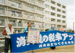 宮城の太白区の会は、大きな横断幕をかかげ、商店街宣伝とともに大団地での宣伝をおこない、多くの人びとに「増税反対」の声を届けました。 |