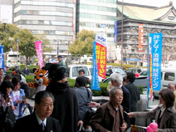 大阪では、難波高島屋前で、消費税廃止大阪各界連絡会、消費税廃止関西連絡会と共同して60人が参加して大宣伝。ぬいぐるみや風船も登場し、一時間半で請願署名が363人から寄せられました。八尾の会、東大阪の会、天王寺の会、藤井寺の会、羽曳野の会、泉北の会も各地域で宣伝。府下全体で合計すると、52人のなくす会への入会、882人から請願署名が寄せられました。 |