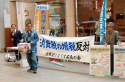 愛知では、19の草の根の会が行動しました。地下鉄沿線での宣伝が取り組まれ、大型パネルがどこでも目立ちました。風船が1万個、テイッシュが2000個配布され、「増税反対」をアピールしました。 |