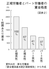 (図表1)正規労働者と非正規労働者の賃金には大差があります。とくにパートタイマーの賃金の低さは目に余るものです。 (図表2) 非正規労働者の激増は、労 働者派遣法の改悪によっても たらされました。85年に労 働者派遣は原則禁止、対象業 務は限定、としてつくられま したが、99年に対象業務は原則自由化され、さらに04年から製造業にも派遣が導入 されたからです。 それは日本経済団体連合会(経団連)の強い要求によるものでした。雇用する労働者の間に差別を持ち込み、労働組合の力を弱めて、賃金を大幅に引き下げることに大きな狙いがありました。この20年間、賃金引き下げによって、大企業の収益はバブル期以上に大きくなりました。 非正規雇用の労働者は、安い賃金で働き、いつでも首を切れる。健康保険・厚生年金・雇用などの社会保険料の企業負担もない。企業の利益が大きくなるのも当然です。 非正規労働者の増加を税制面から推進した消費税 大企業に奉仕する政府は、企業のリストラに補助金を出し、企業が非正規雇用の労働者で代替することを援助しました。さらに、消費税が非正規労働者増加を税制の面から推進したことも事実です。 消費税は、売上げにかかった税額から、仕入れにかかった税額を差し引いて、差額を納税する仕組み(仕入税額控除)になっています。つまり粗利(あらり・正規労働者の賃金はこれにふくまれる)にかかるのが消費税です。 正規労働者を非正規労働者に切り換えれば、賃金は外注費となり、消費税を控除される外注商品に化けることになります。 ですから企業にとっては消費税が、正規労働者を減らし、非正規労働者に切り換える動機の一つになることは確かです。 そのうえ、輸出は免税になっていますから、輸出依存度の高い大企業は「輸出戻し税」の増加となって、莫大な利益を上積みすることになります。トヨタ自動車は、この仕組みによって〇五年には一九六四億円も還付されています。大企業にとって消費税は「おいしい税金」であり、税率が上がれば、こうした利益 はさらに増えるのです。 消費冷え込ませ内需を抑制した消費税 日本経済はバブル期の後遺症である不良資産問題を処理し、自公政権の「構造改革」によって、長期の「好況」を続けることができたと大宣伝されてきました。しかし、国民の目線で見れば、事実は違