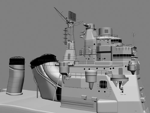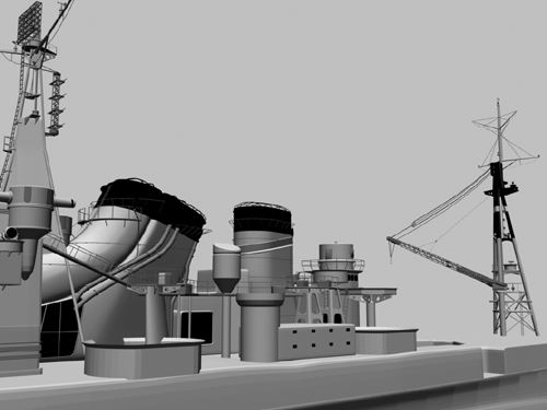 今日は煙突二本と前部マストのモデリングが終わったよ。^^ 艦橋に較べると楽だったなぁ・・・。