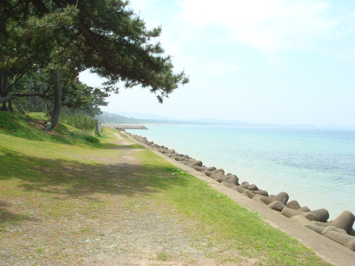 松林の中を片側一車線の道路が走っていて、海岸と道路との間の松林の中に最近作られたのか遊歩道が整備されている。所々にベンチや休憩所も