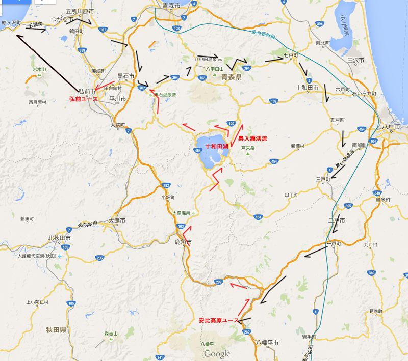 十和田湖子の口14:00発→国道102号→弘前市内ひろさきユースホステル16:00着(泊)(岩手県→青森県)