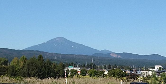 奥羽山脈を横手ICまで下り、国道13号の湯沢横手道路を新庄方面へ、途中右3時方向に青空をバックにして綺麗な山が見える、「鳥海山」だ!!。