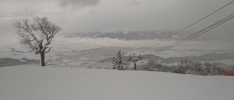 富良野スキー場(北の峰ゾーン・ゴンドラリフト頂上より富良野市街と雲に隠れた富良野岳)