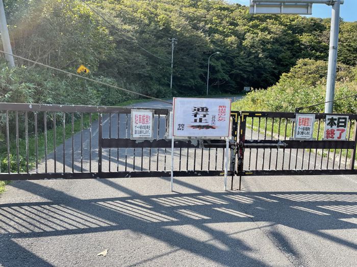 14時30分、神威岬への入口に到着するが、周りの様子がチョットおかしい??。地元の車が数台、入口で右往左往している。オレも路肩にバイクを止めて